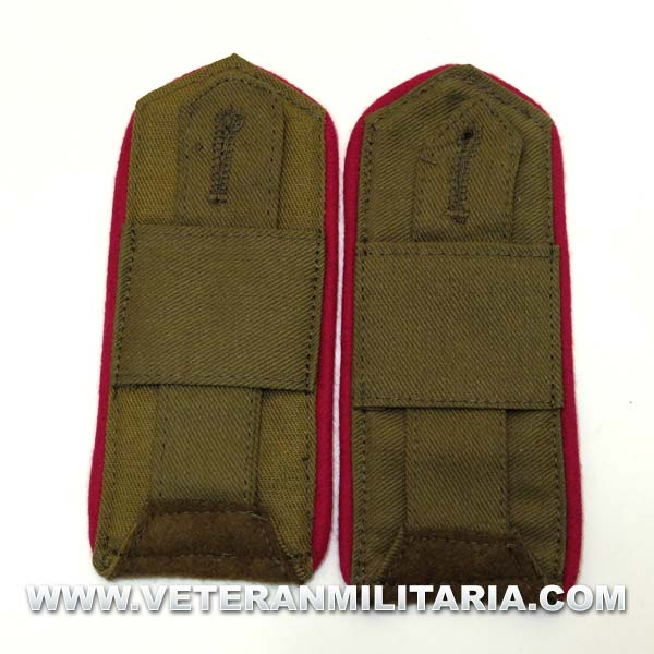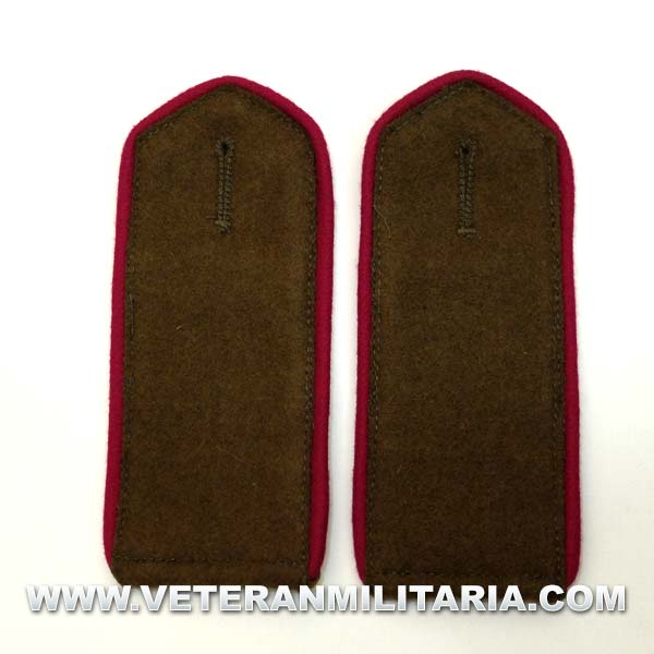 Reproducción exacta de las hombreras rusas M43 utilizadas en la Segunda Guerra Mundial, fabricadas en lana color marrón olivo con el ribete de infantería (color frambuesa). Al reverso lengüeta.