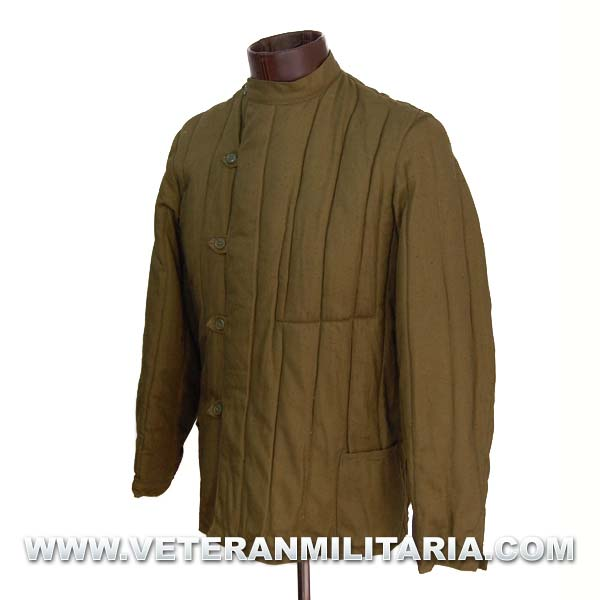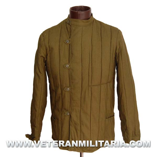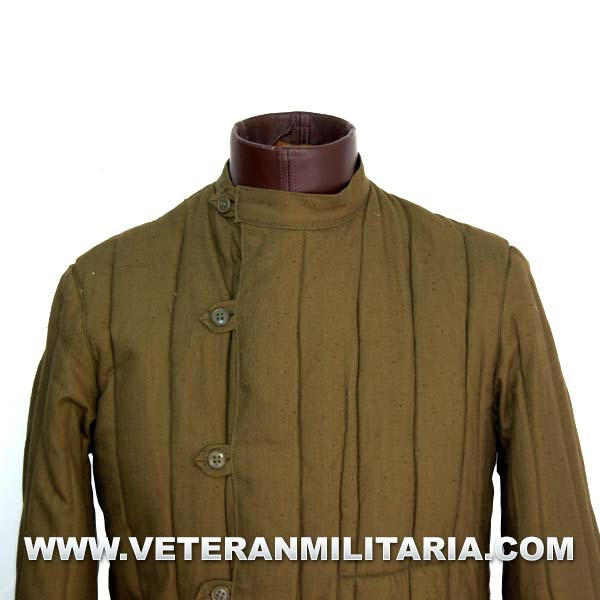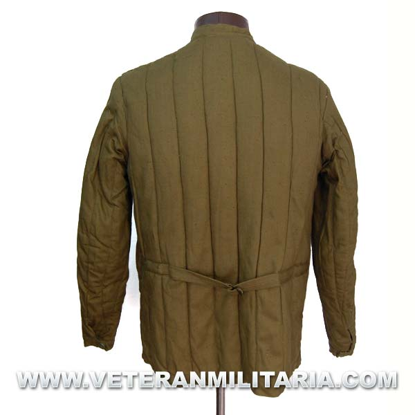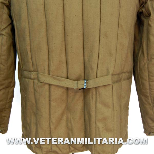 Chaqueta Telogreika original de postguerra, confeccionada en algodón y tiene un diseño de nervios acolchado rellenos de lana tipo algodón. Se cierra mediante cinco botones y en su parte inferior hay bolsillos laterales.En la parte posterior de la chaqueta lleva una cinta con una hebilla a la altura de la cintura, que permite ajustarla al cuerpo.