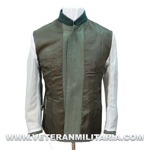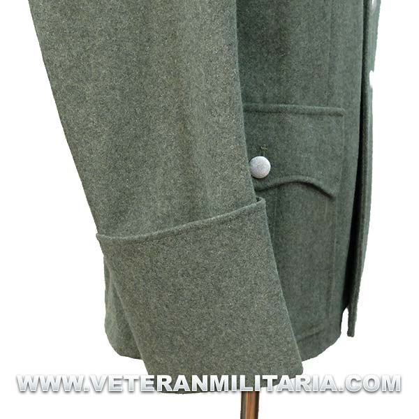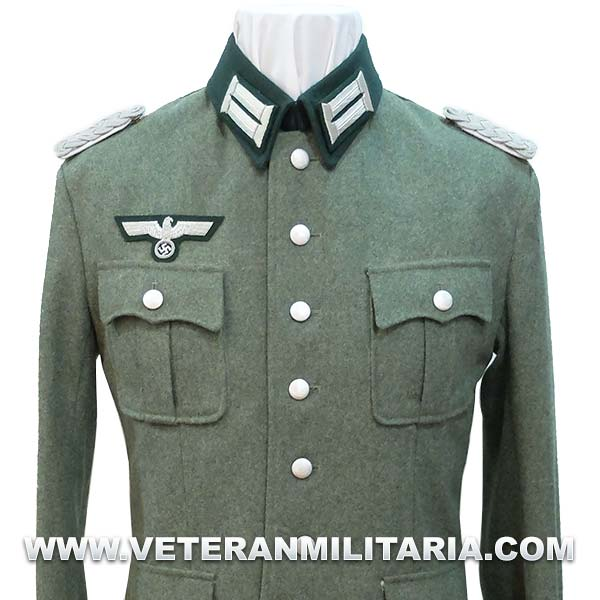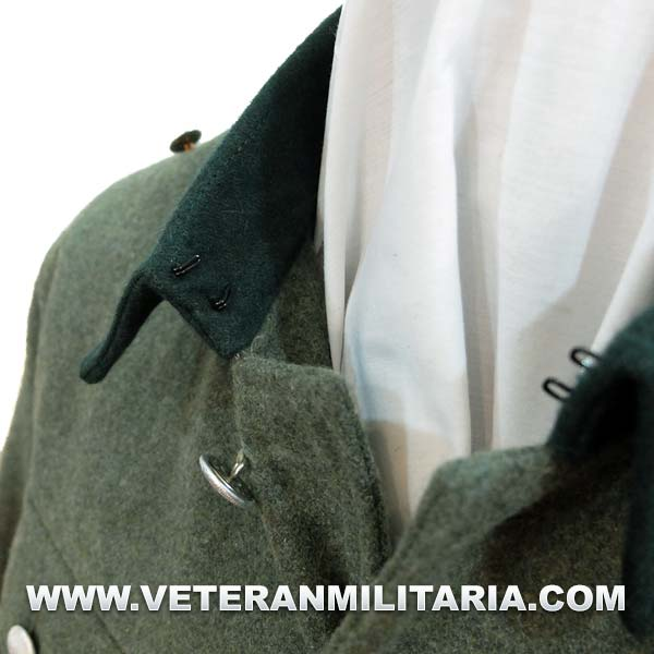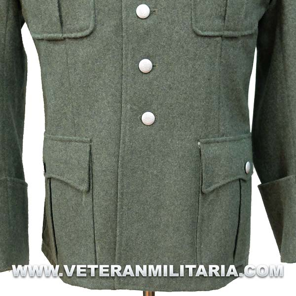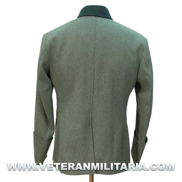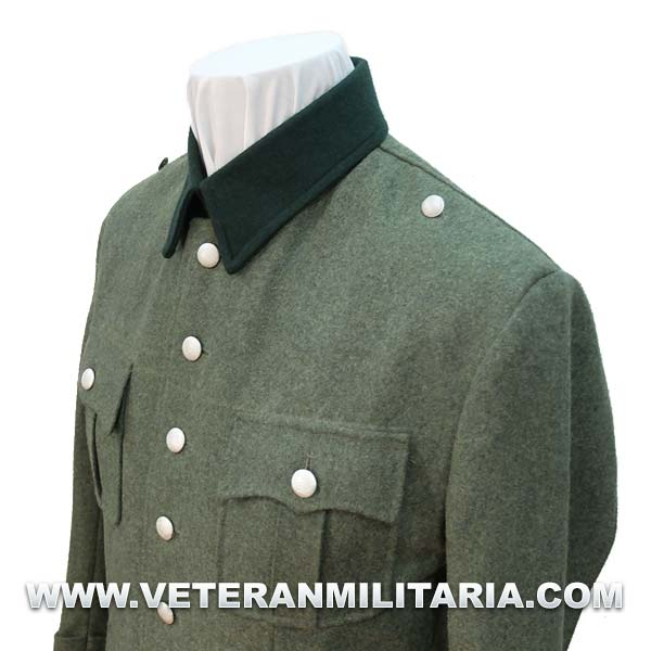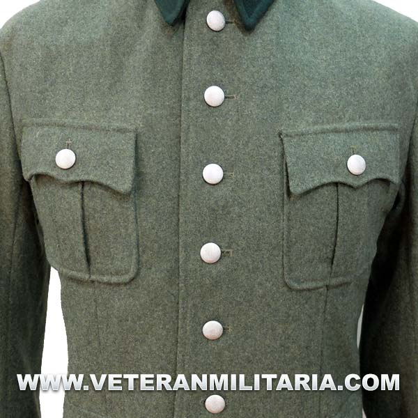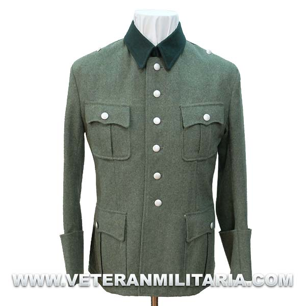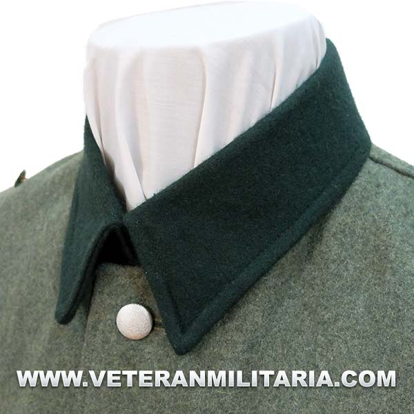 Feldbluse M36 fabricada de lana de gran calidad de color feldgrau, bocamanga francesa, cuello de color verde oscuro sierre con canchos, botones granulados.