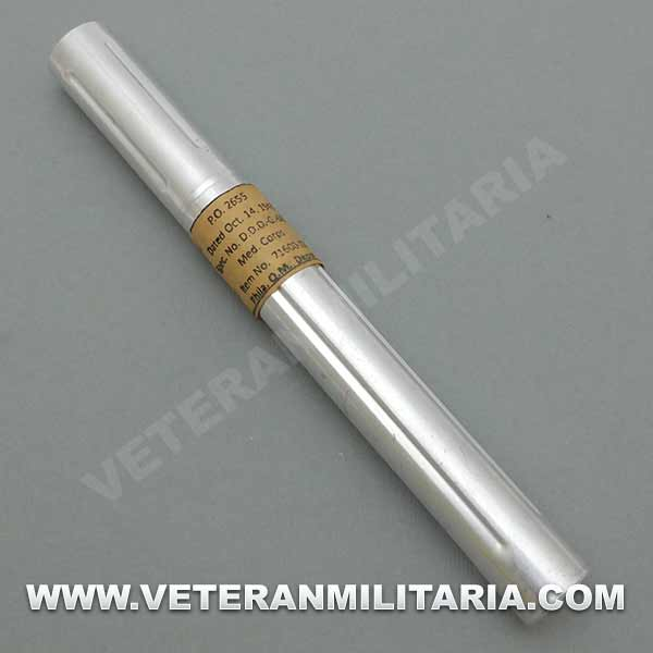 Tubo de aluminio, en el interior tubo de cristal e hisopo de algodón, en la etiqueta numero de serie y fecha 1943 medical corps.