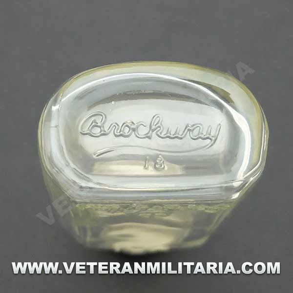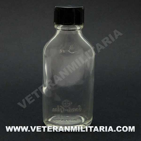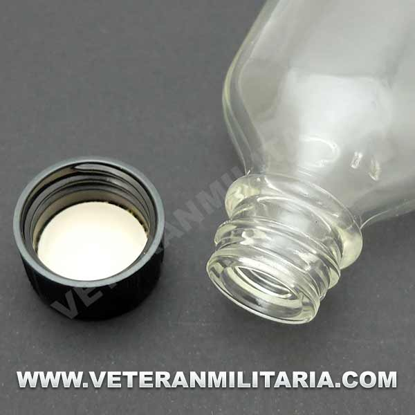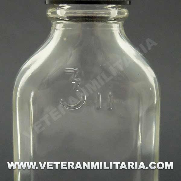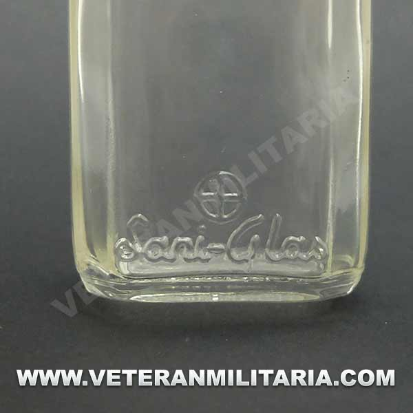 Botella de vidrio transparente de la marca Brockway, en la parte trasera troquelado numero 3 ii y Sani-Glas, tapón de plástico negro. Este tipo de botellas fueron utilizadas por el Medical Corps.
