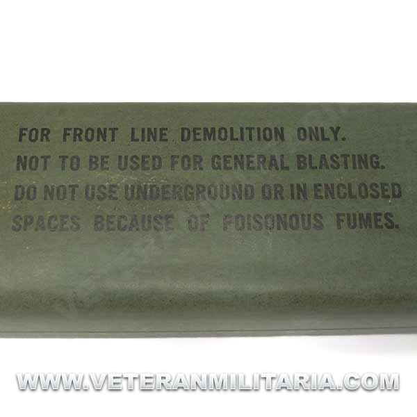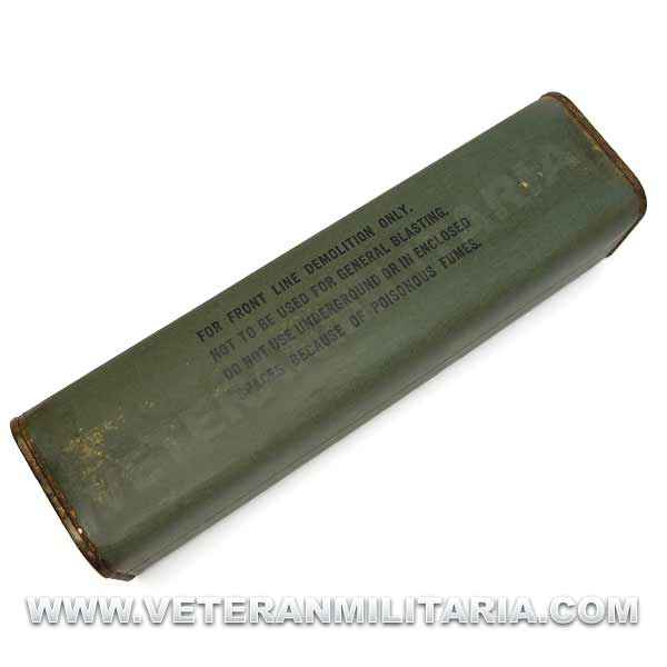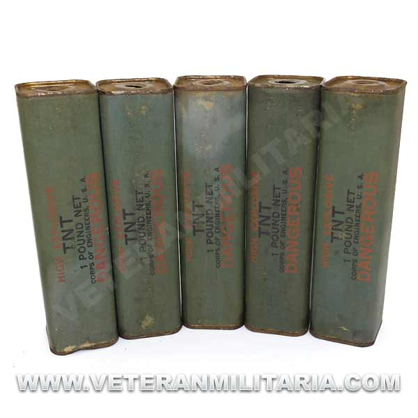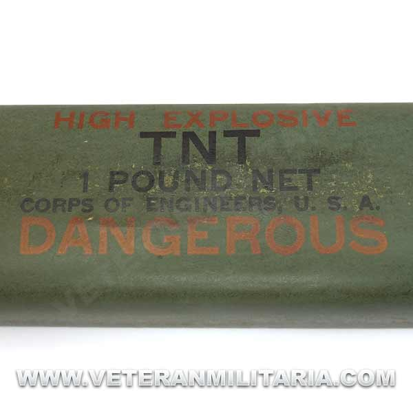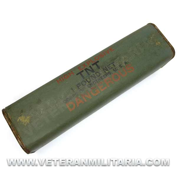 Bloque de carga TNT de una libra (450g) del cuerpo de ingenieros estadounidenses, las cajas están totalmente vacías, el cuerpo esta hecho de cartón encerado de color verde y ambos extremos están hechos de acero prensado delgado. Estas cargas fueron ampliamente utilizadas durante la Segunda Guerra Mundial.