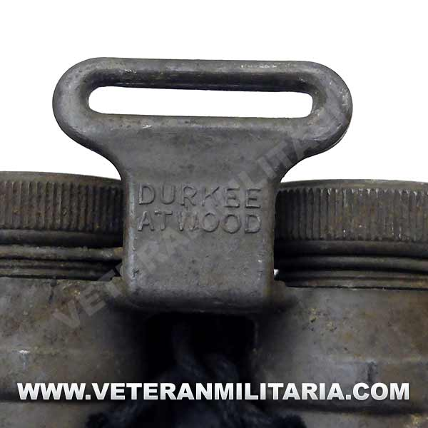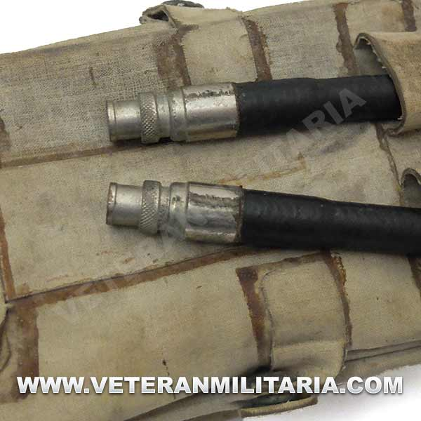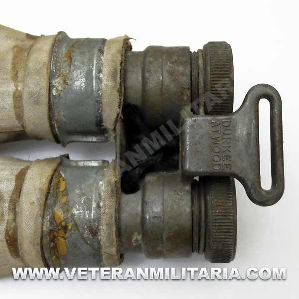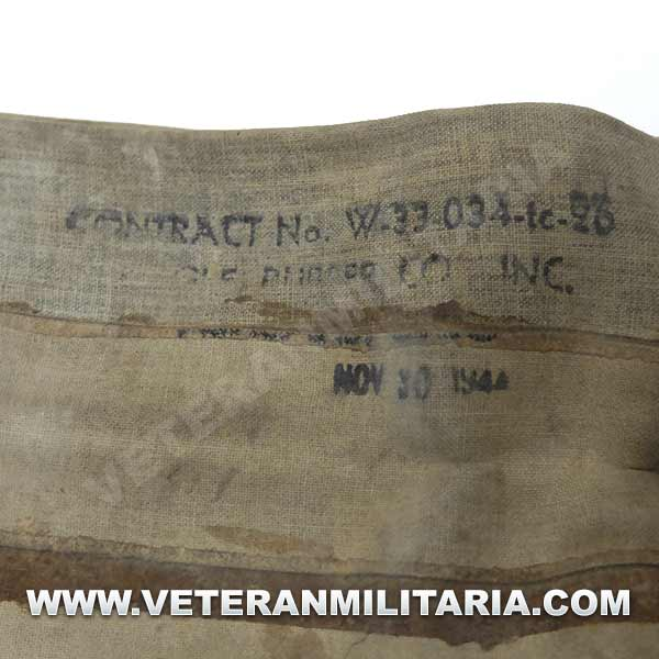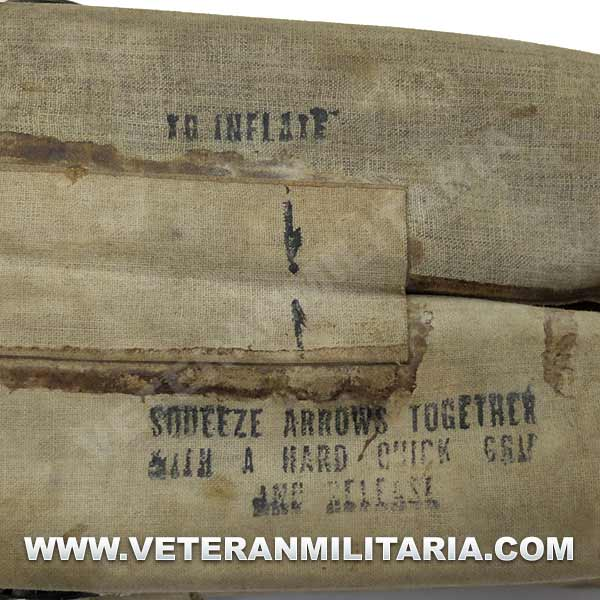 Cinturón de flotación inflable M1926, fabricado por Durkee Atwood Co. Hebilla y gancho de metal, consta de dos tubos paralelos que se inflan accionando manualmente dos botes de bombonas. La fecha de fabricación 1944. El cinturón conserva su flexibilidad.