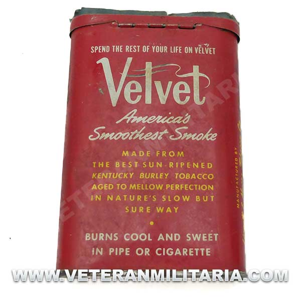 Lata de tabaco Americano Velvet de segunda guerra mundial, lata metálica, vacía.