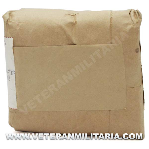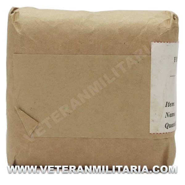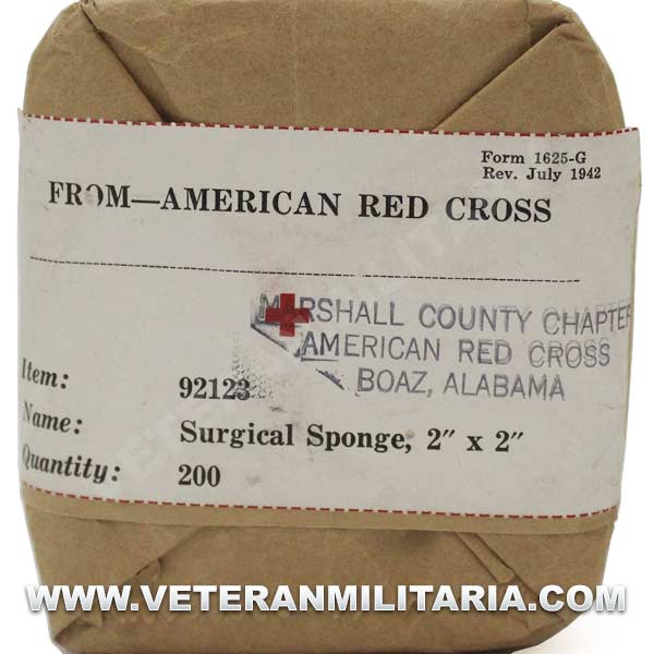 Esponja quirúrgica de la Cruz Roja Americana, envasada en papel kraft, en la parte delantera etiqueta FROM – AMERICAN RED CROS, fecha de fabricación 1942, numero del lote.