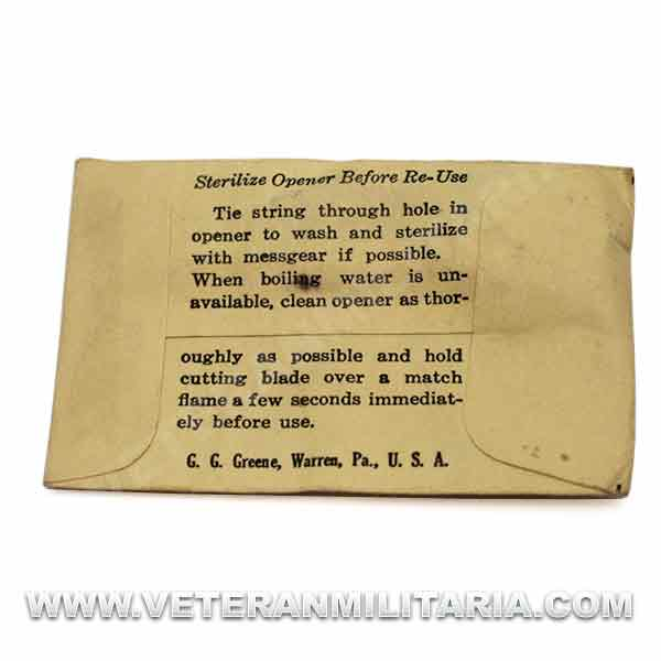 Abrelatas P-38 original estadounidense de la Segunda Guerra Mundial, sin usar, el sobre está cerrado en el interior abrelatas, fabricado por G.G. Greene, Warren