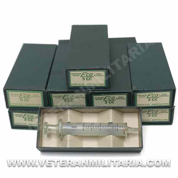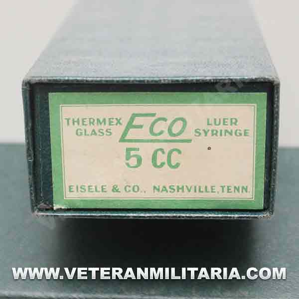 Jeringuilla de vidrio U.S en caja, caja de cartón con etiqueta "ECO 5cc" fabricada por Eisele & Co. en Nashville, Tennessee.