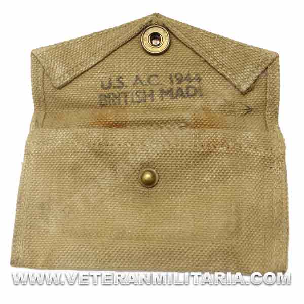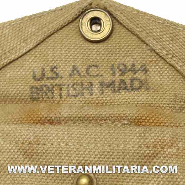 Bolsa de primeros auxilios de fabricación britanica con kit de primeros auxilios naranja, en el interior marcajes de fabricante U.S A.C. y la fecha 1944.