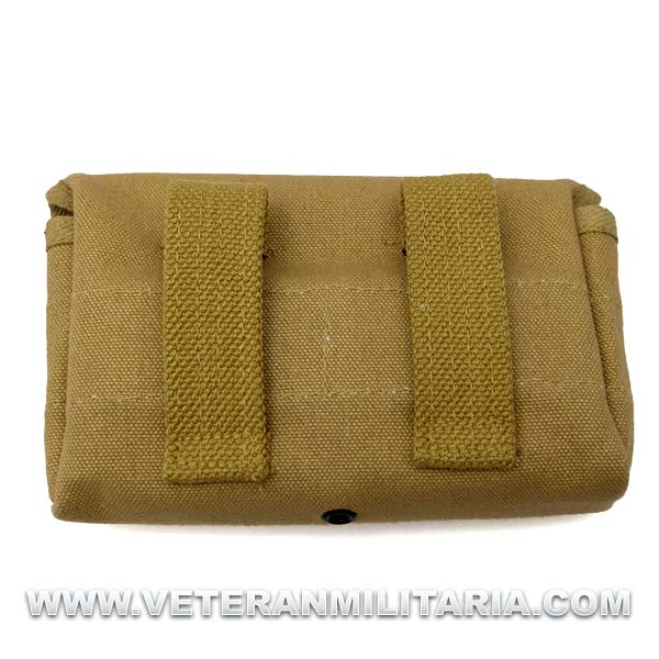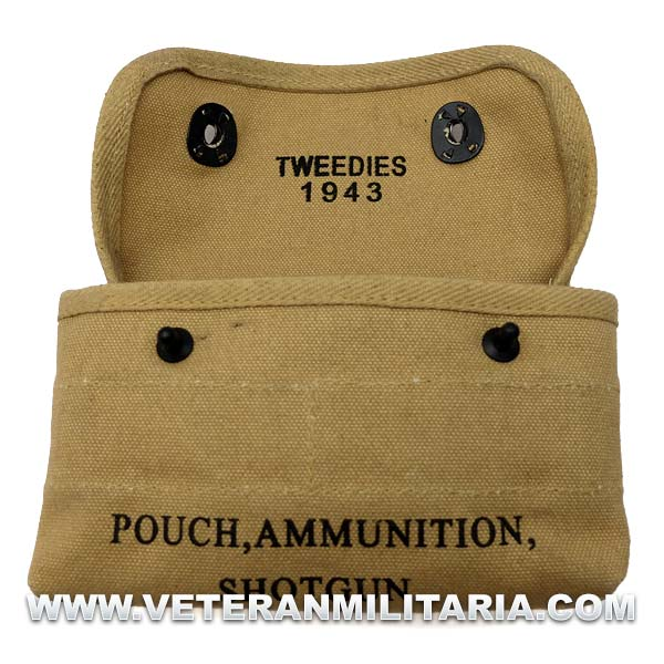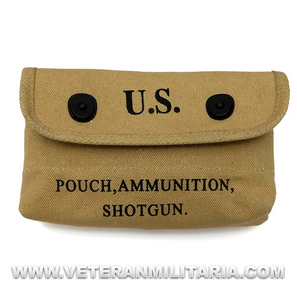 Reproducción de la bolsa de munición para la escopeta, fabricada en lona de color caqui, en el interior separadores para 12 cartuchos, en la parte trasera dos trabillas, con marcajes.