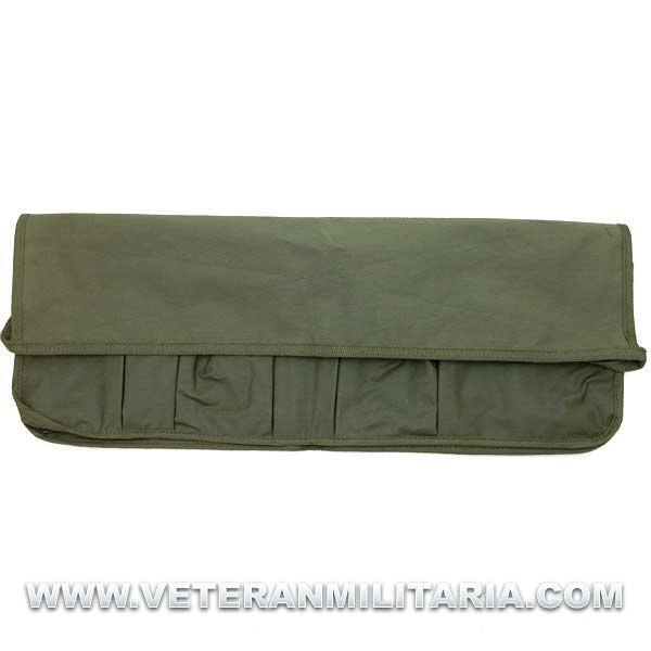 Reproducción de la bolsa de aseo, fabricada en tela impermeable, contiene varios compartimientos para guardar jabón, cepillo de dientes, etc. Tiene un juego de cordones.