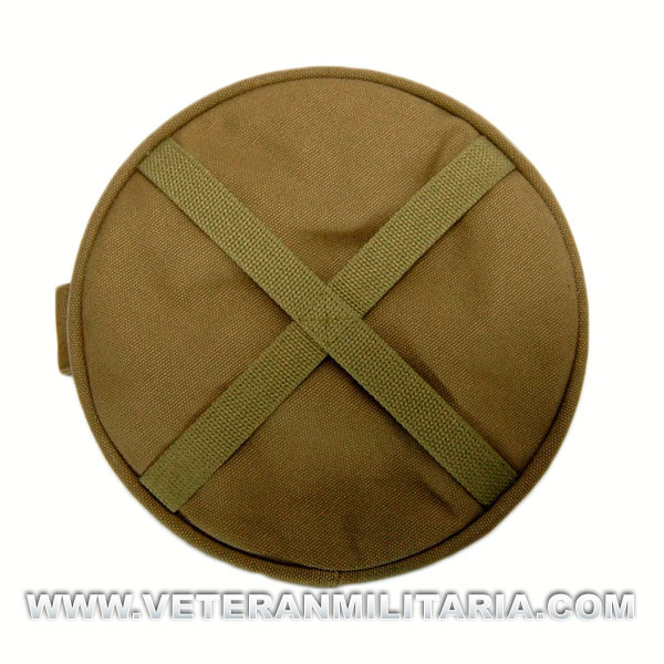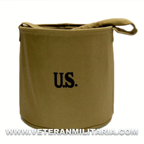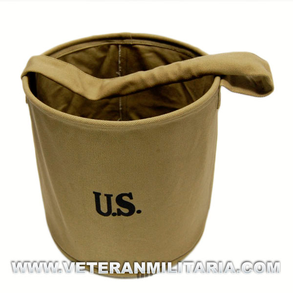 Cubo fabricado en lona color caqui, para el transporte de agua, plegable, asas acolchadas, capacidad de 7,5 litros. Utilizado por las tropas Americanas. Réplica.