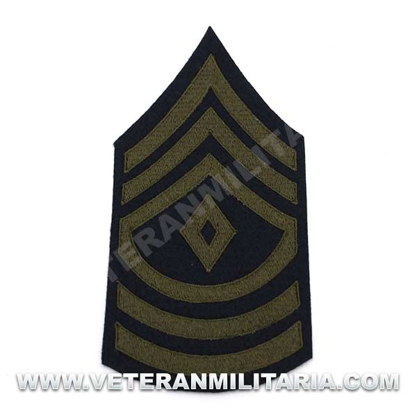 Galón Sargento Primero – (First Sargeant) bordado con hilo color caqui-oliva sobre una base azul oscuro.
