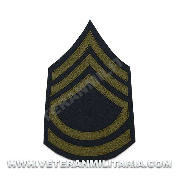 Galón de Technical Sergeant, bordado con hilo color caqui-oliva sobre una base azul oscuro.