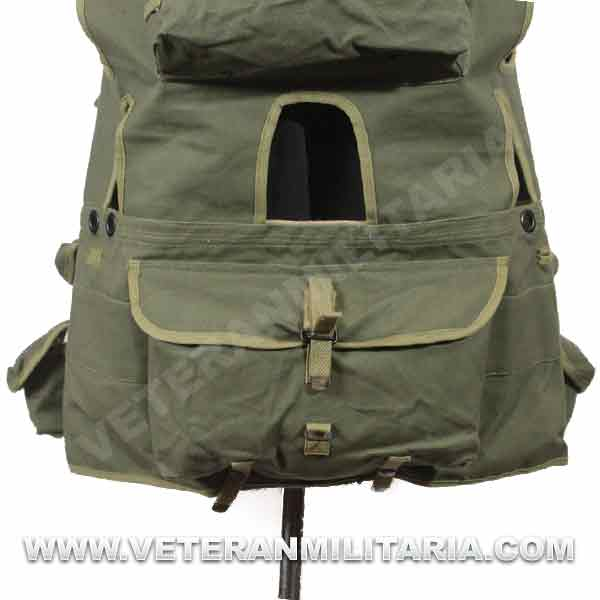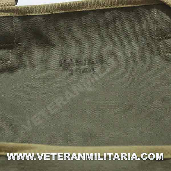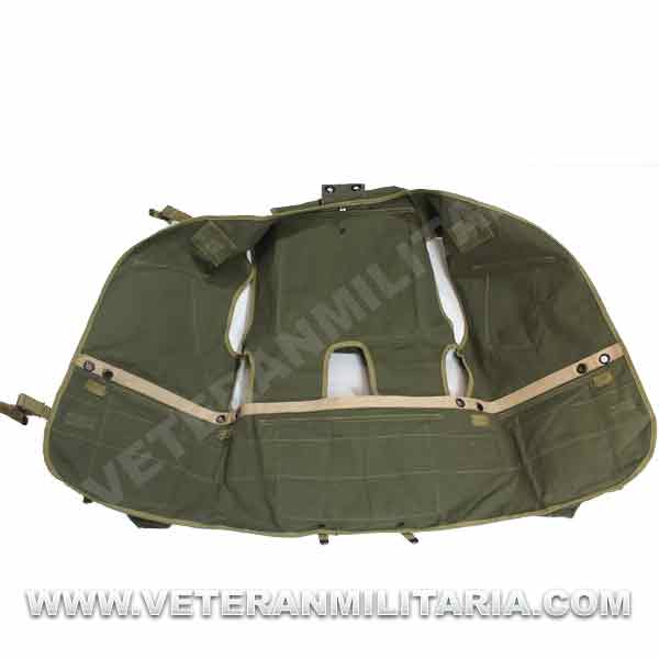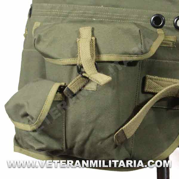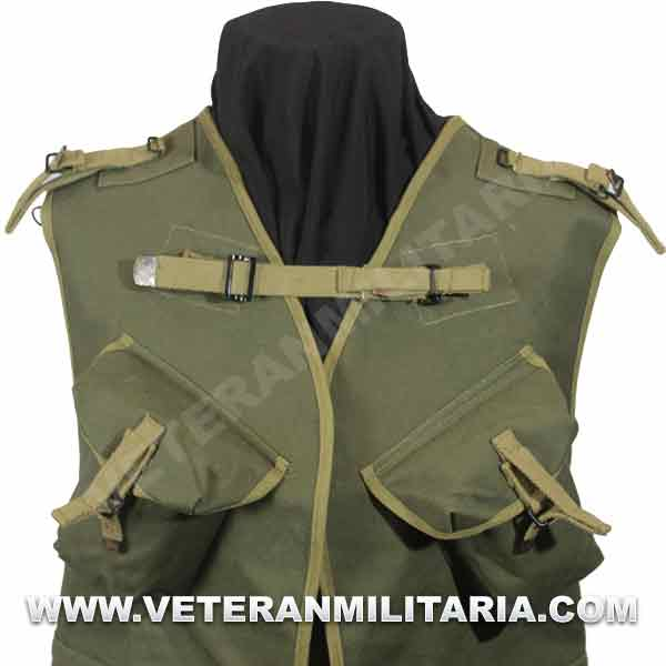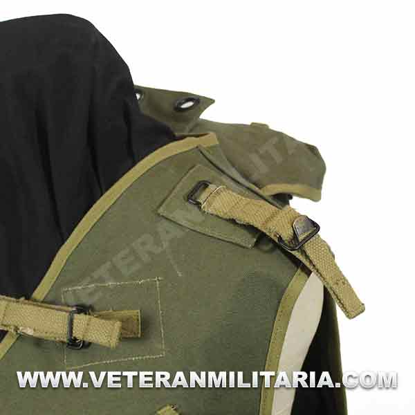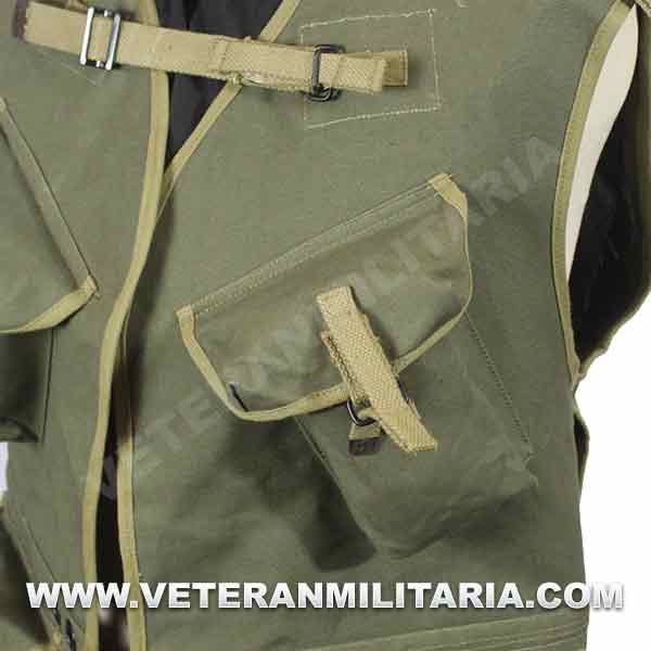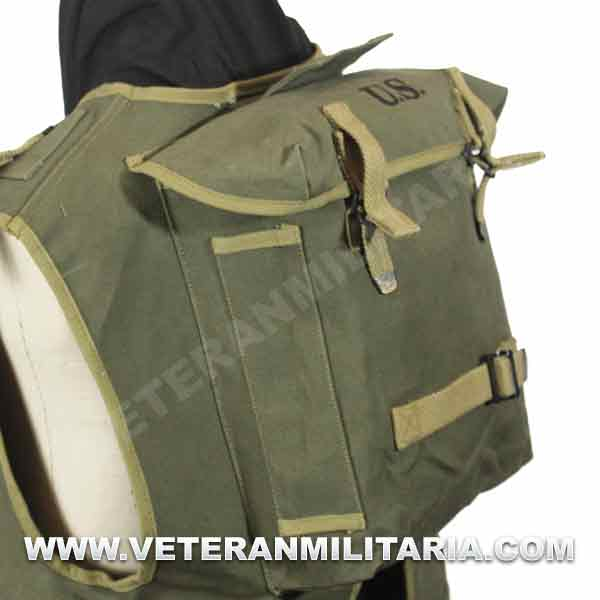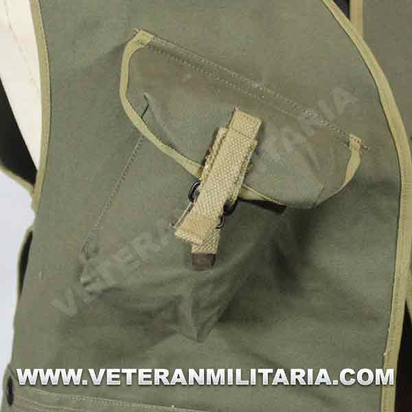 Chaleco de asalto US fabricado en lona de algodón de color verde oliva con cuatro bolsillos grandes en la parte delantera con correas de liberación rápida y 2 bolsillos para granadas más pequeños en la parte inferior. Los ojales alrededor de la cintura están diseñados para guardar equipo (funda de pistola, etc.). En la parte superior de la espalda hay una pestaña para la herramienta de trinchera.
